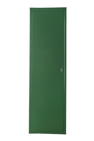 Hoja de 62mm de espesor, construida con dos planchas de acero galvanizado 0.7mm de espesor, ensamblada sin soldaduras. Cerradura de leva con llave de triángulo, centrada sobre la hoja.