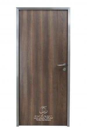 Puerta Corta-Fuegos revestida con Panel Laminado Estratificado de Alta Presión de 0.7mm, que le confiere un acabado personal y una gran resistencia al rayado, abrasión e impacto, poco mantenimiento y clasificación de hasta EI2 120.