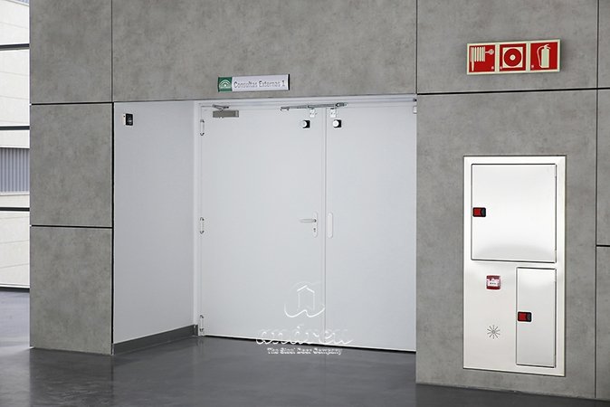 La puerta Corta-Fuegos Turia es el modelo que mayores opciones de fabricación pone a su disposición, tanto en lo referente a medidas como accesorios especiales. Está disponible en versiones de una y dos hojas, ésta última con posibilidad de asimetría.